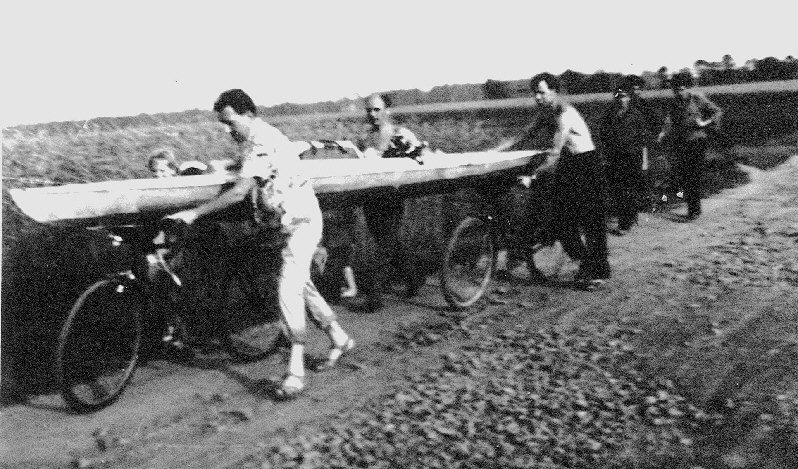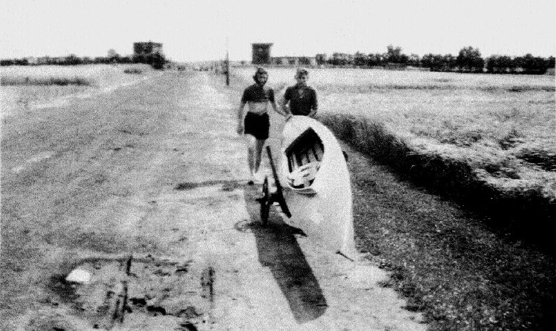 Chłopcy z Przezchlebia mieli swój Patent - na transport kajaka - na połówce wózka - podobnie jak na dłużycy